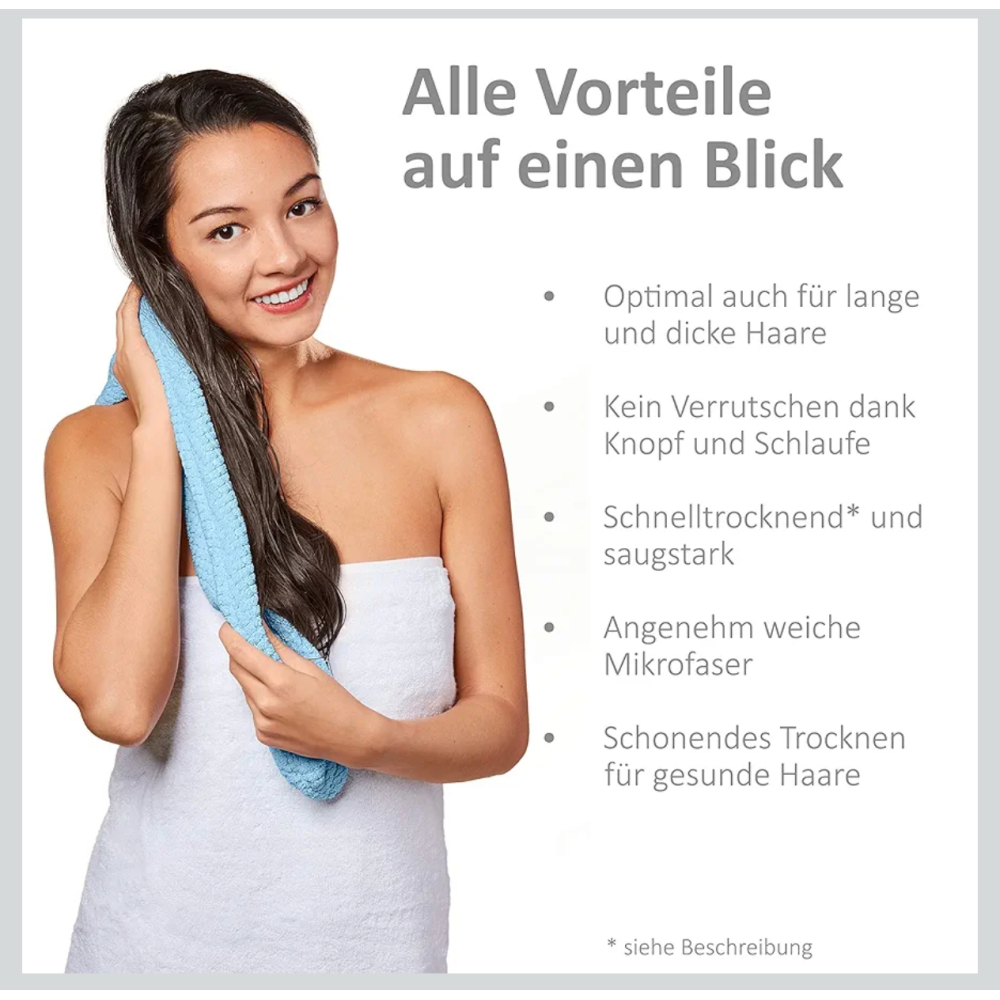 De zijdezachte microvezelstof voelt licht aan en biedt een aangenaam draagcomfort. De haartulband is speciaal ontworpen met een hoge zuigkracht, wat betekent dat het natte haar snel en voorzichtig droogt. Dit zorgt voor een gezonder en sterker uiterlijk van je haar.