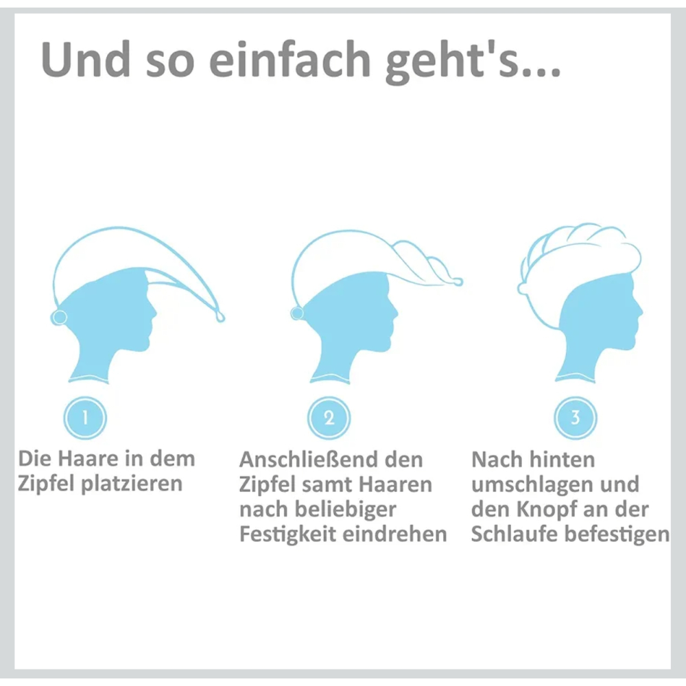 Eenvoudig in gebruik: Plaats de tulband, draai hem, sla hem naar achteren om en knoop hem vast.